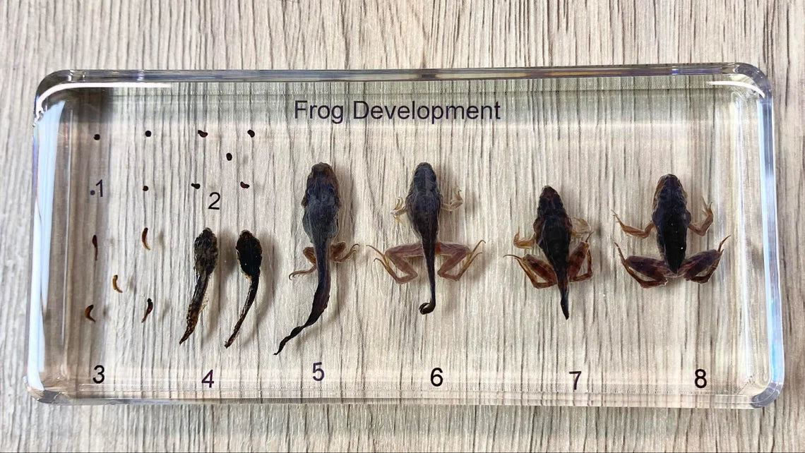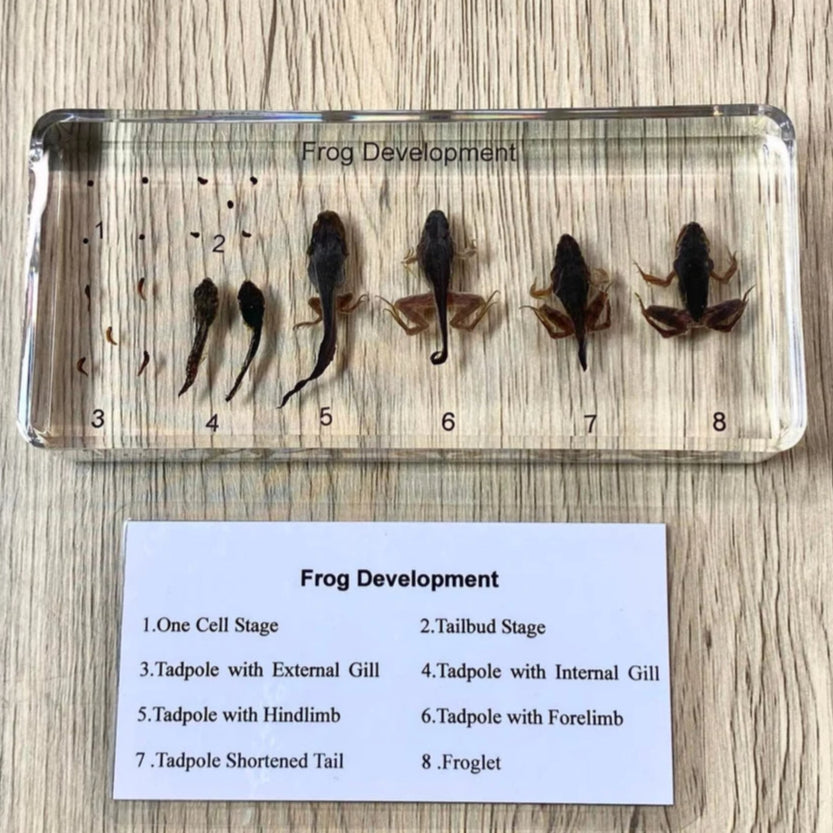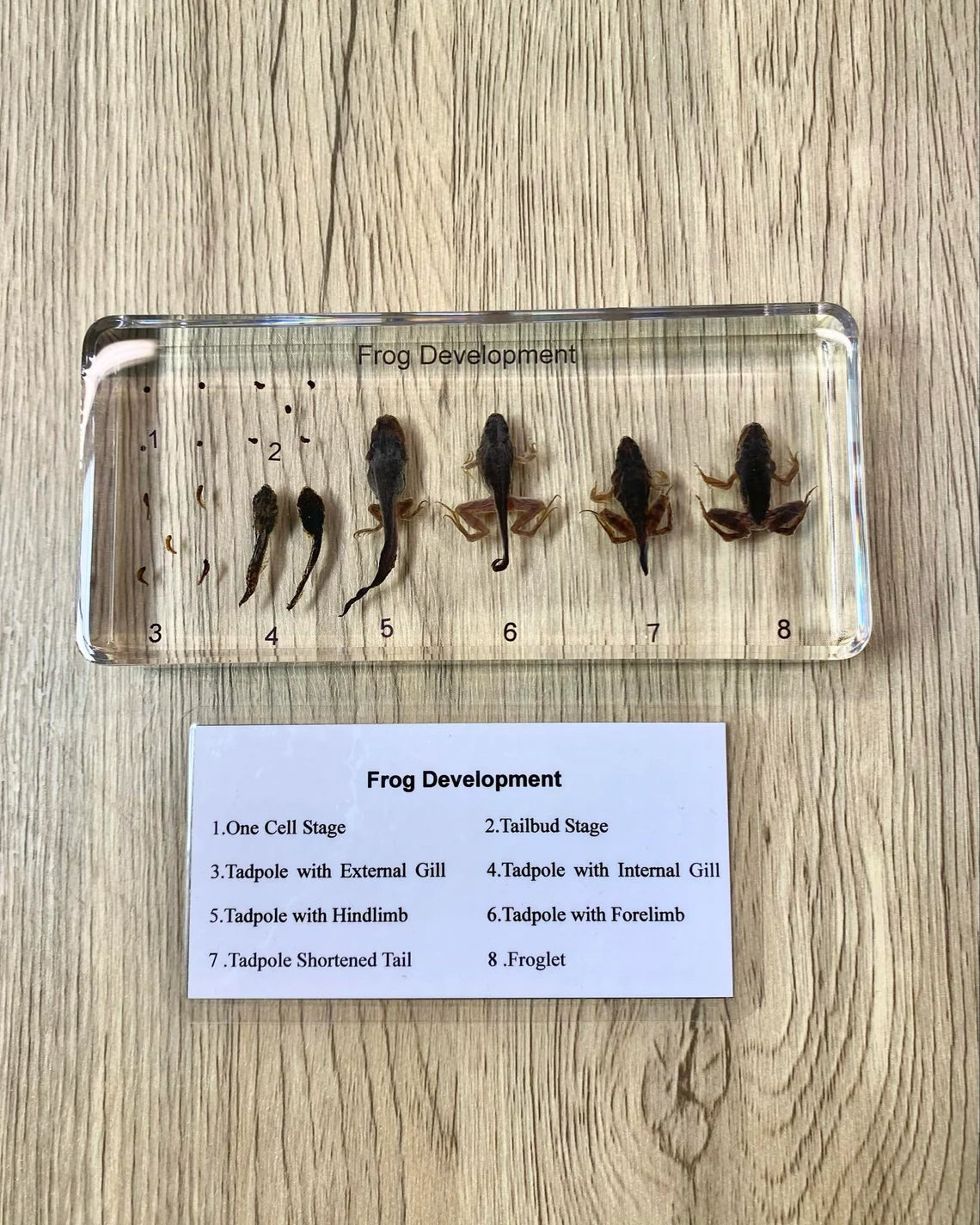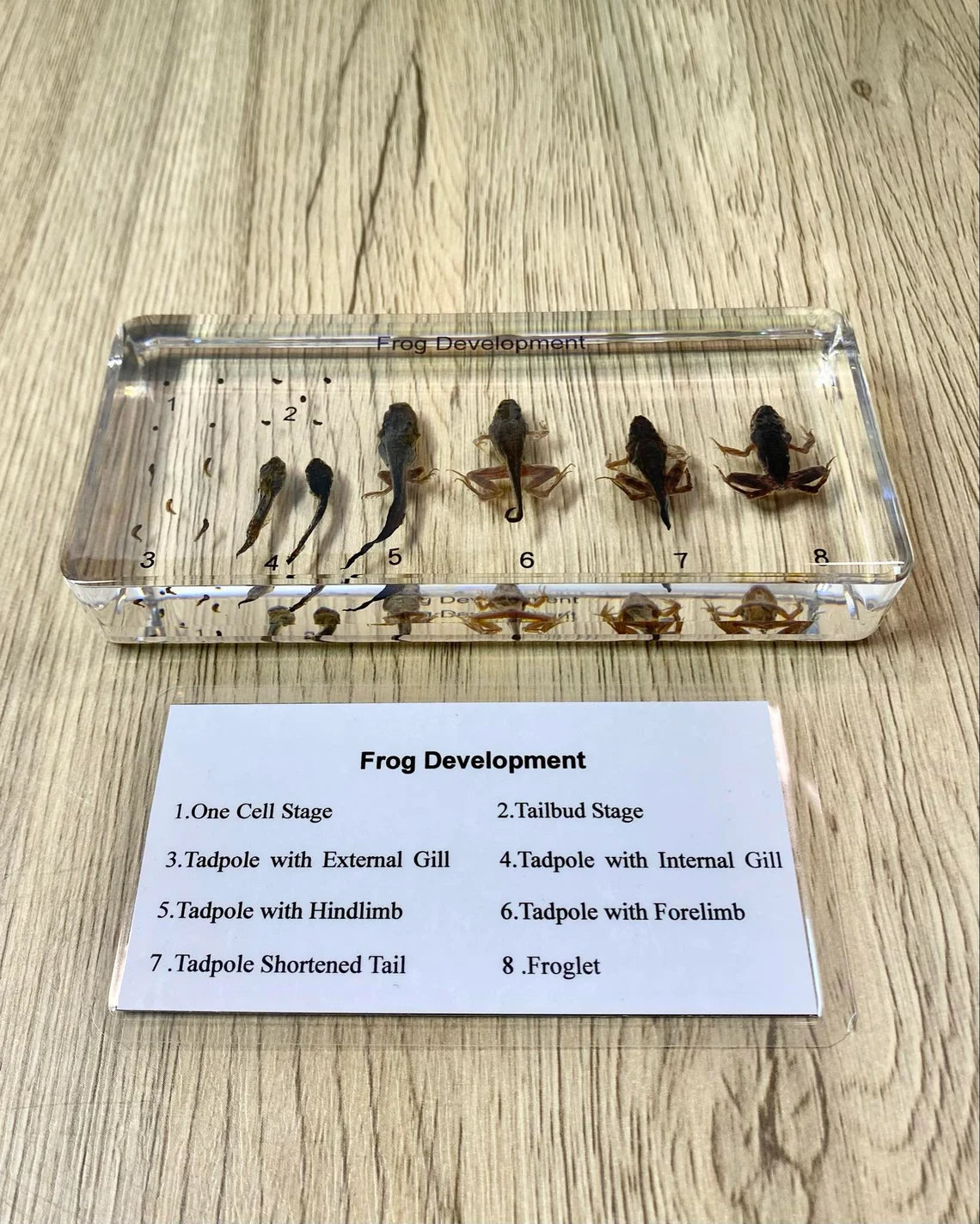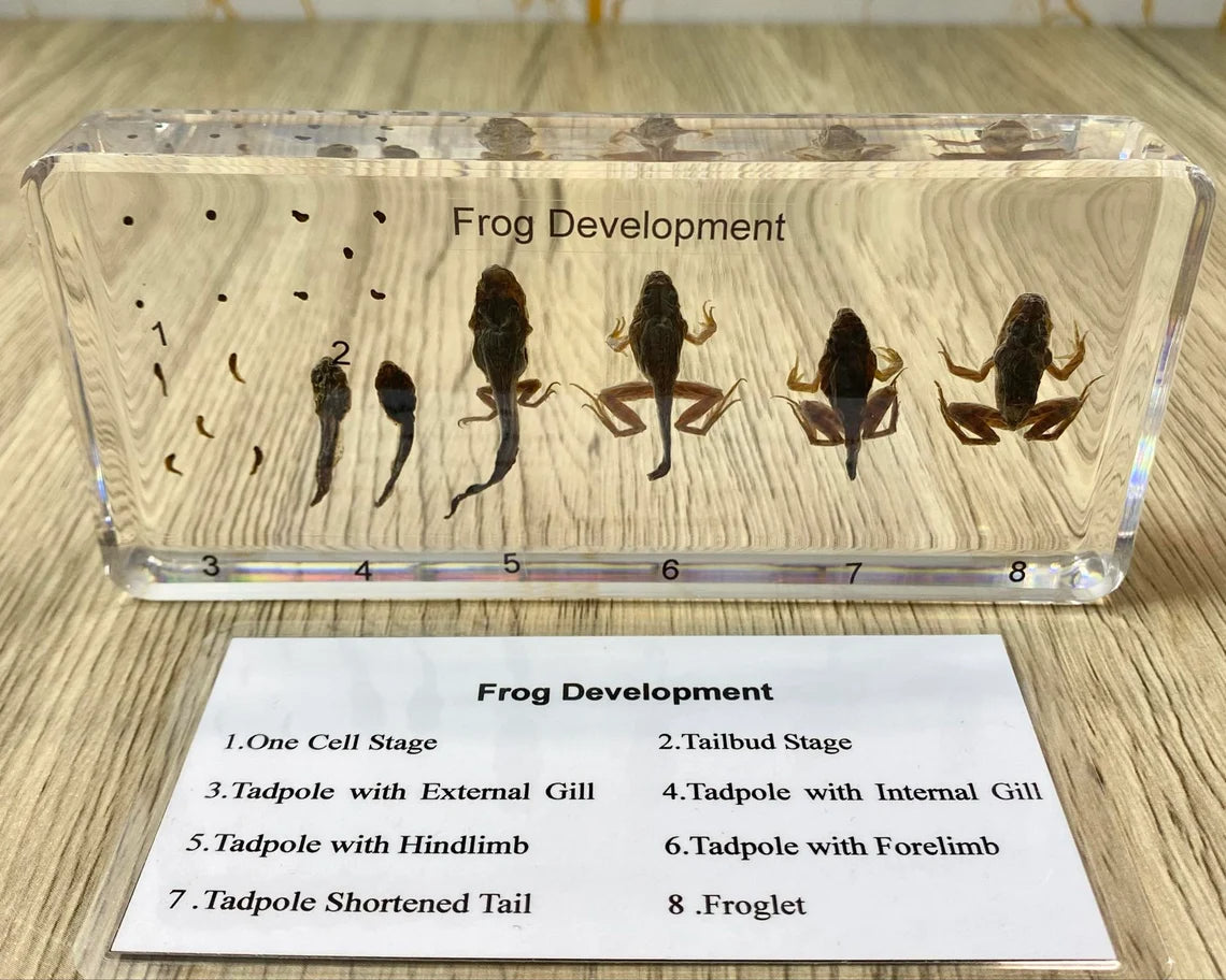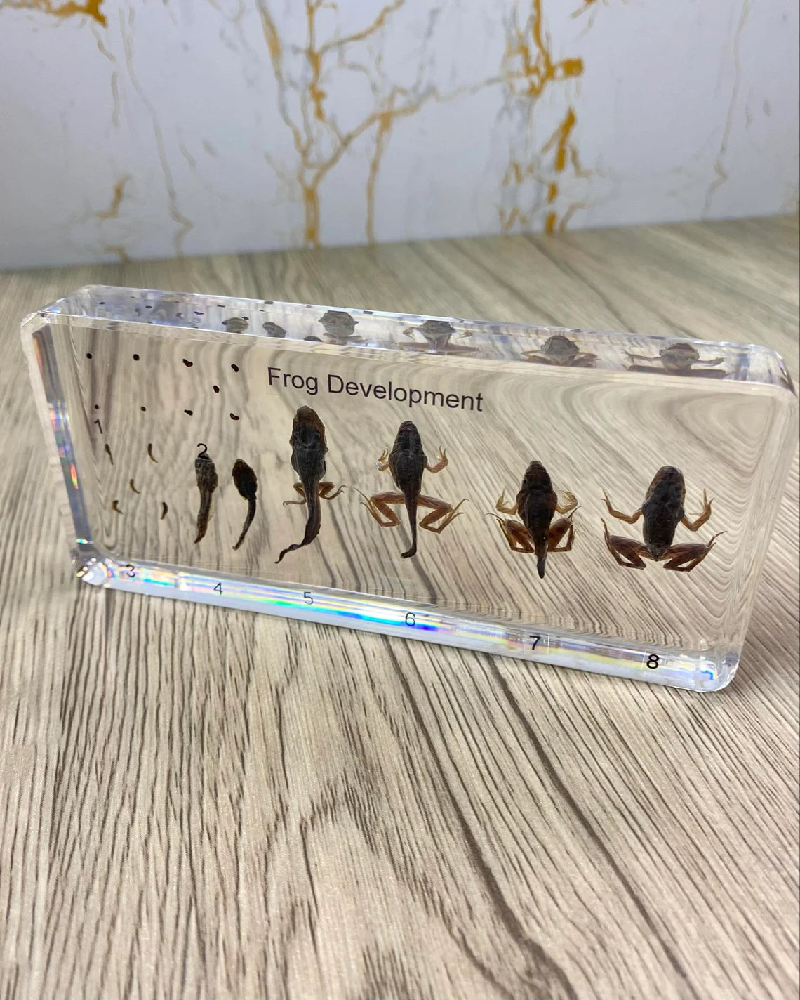 This taxidermy shows the stages of development of frogs encased in a clear acrylic block filled with resin. It comes with the laminated paper that describes the different lifecycle stages. It can be used a decoration piece, a functionable paperweight or as an educational aide. The intricate details of each specimen are preserved beautifully, making it a perfect addition to any collection of taxidermy or animal collectables. Crafted from high-quality resin, this paperweight is sturdy and durable, ensuring that it will last for years to come.