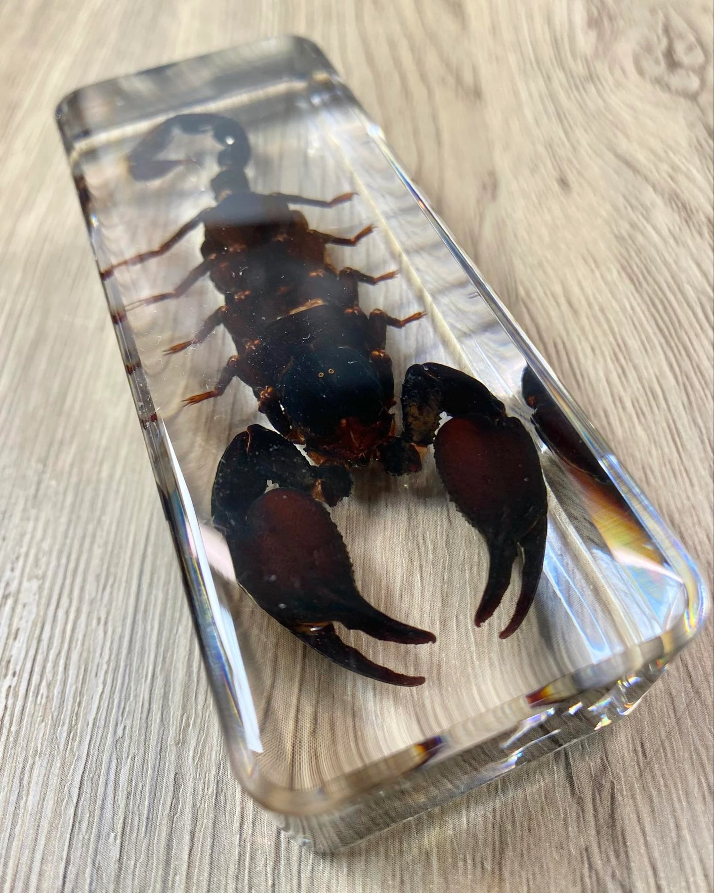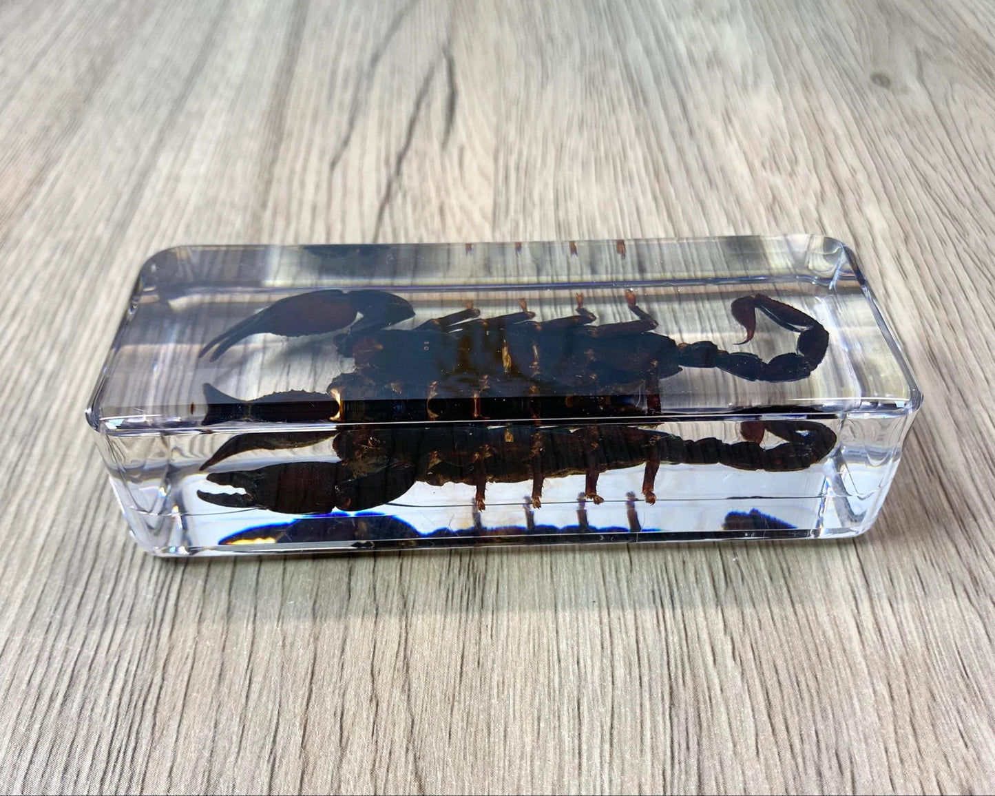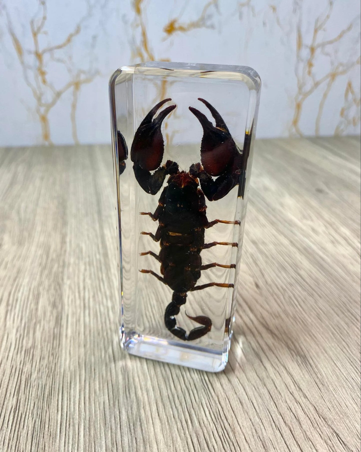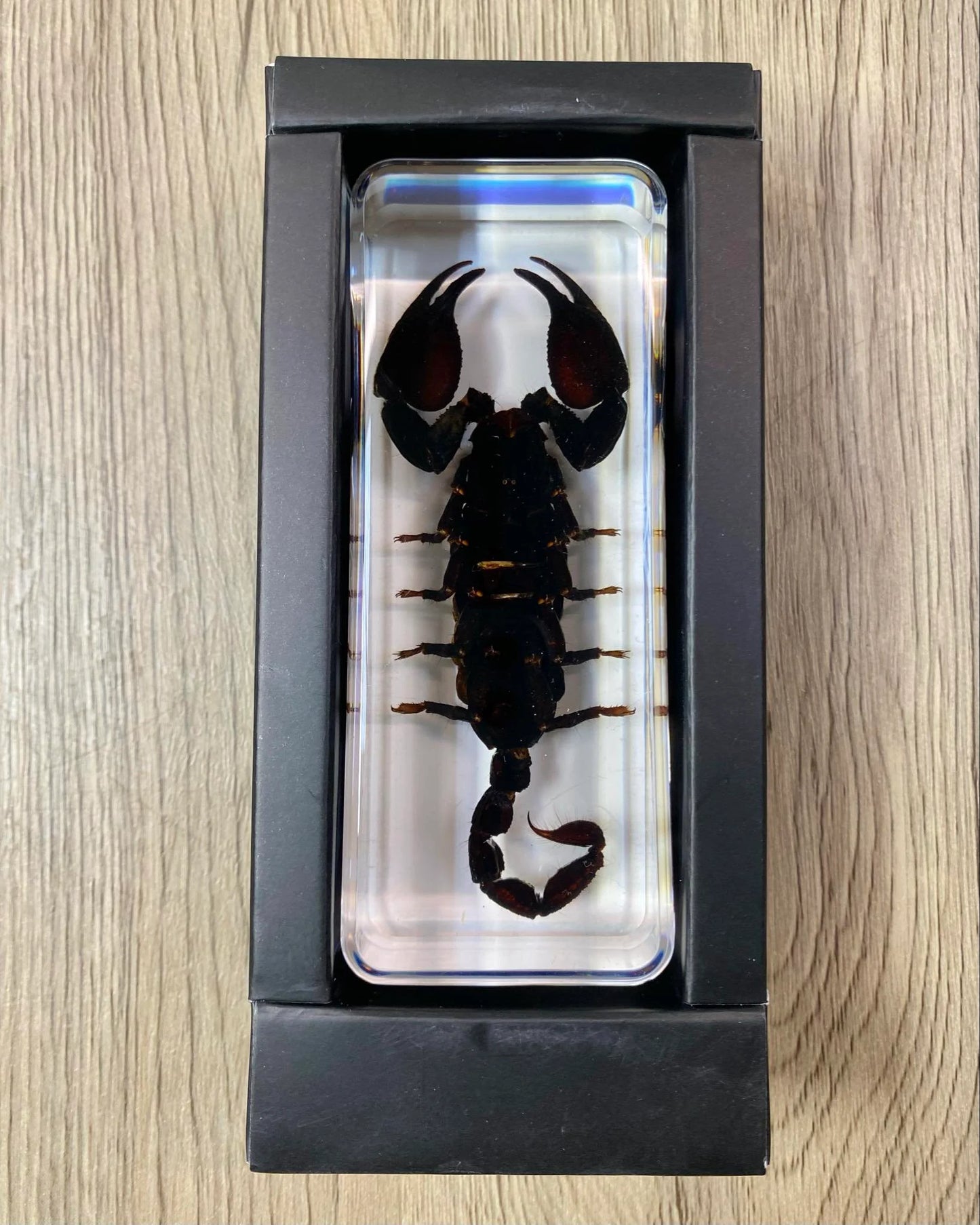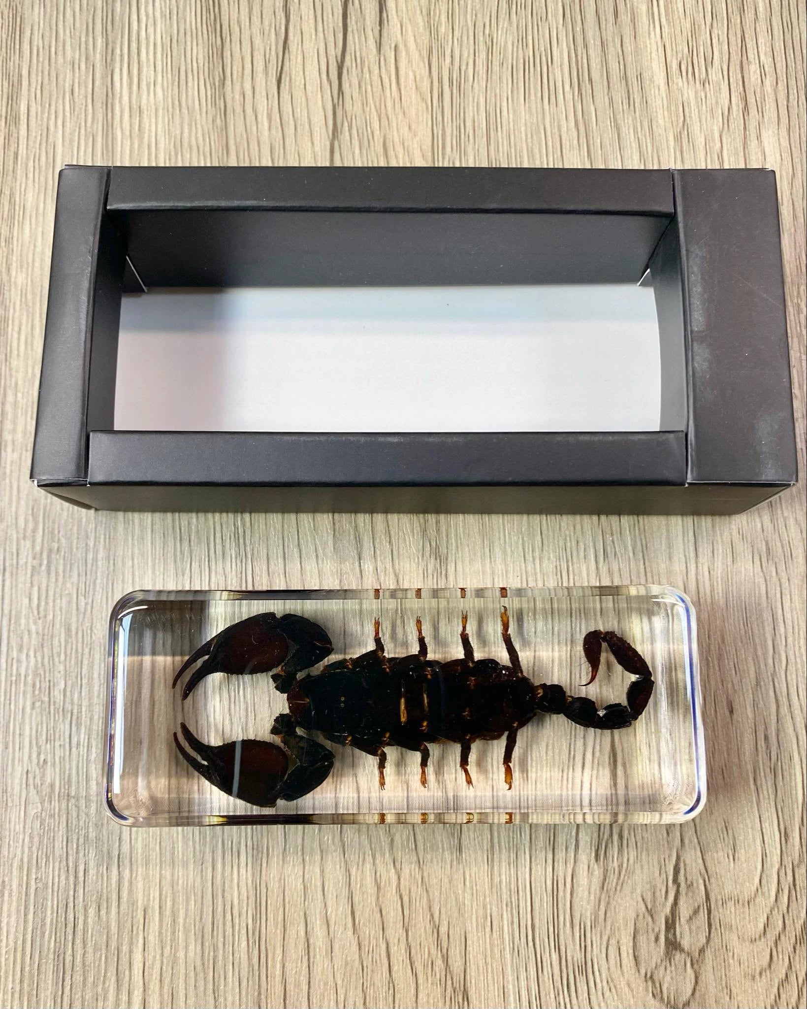 This is taxidermy can be a functionable paperweight, it features a large Black Scorpion encased in a clear acrylic block filled with resin. The intricate details of each specimen are preserved beautifully, making it a perfect addition to any collection of taxidermy or animal collectables. Crafted from high-quality resin, this paperweight is sturdy and durable, ensuring that it will last for years to come. This item is ideal for anyone who appreciates the beauty of insects and butterflies and is looking for a unique and eye-catching display piece. Add it to your collection today!