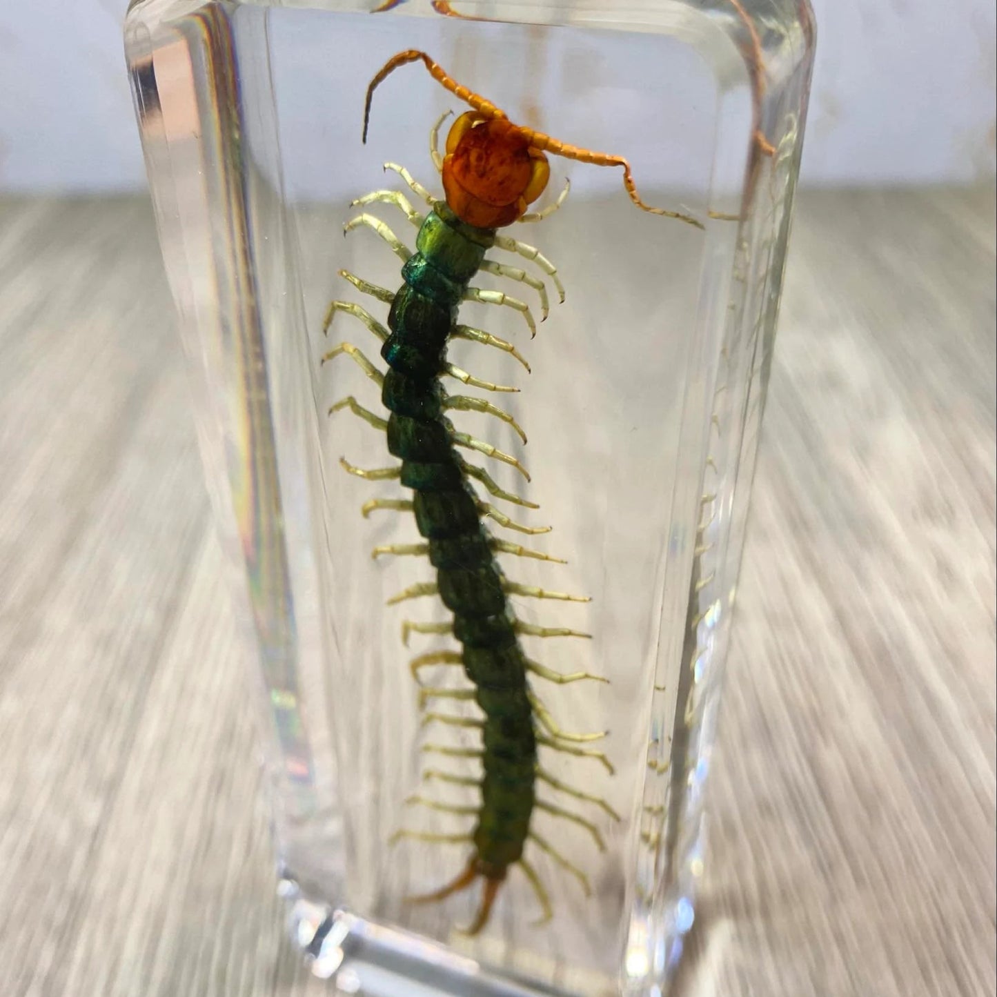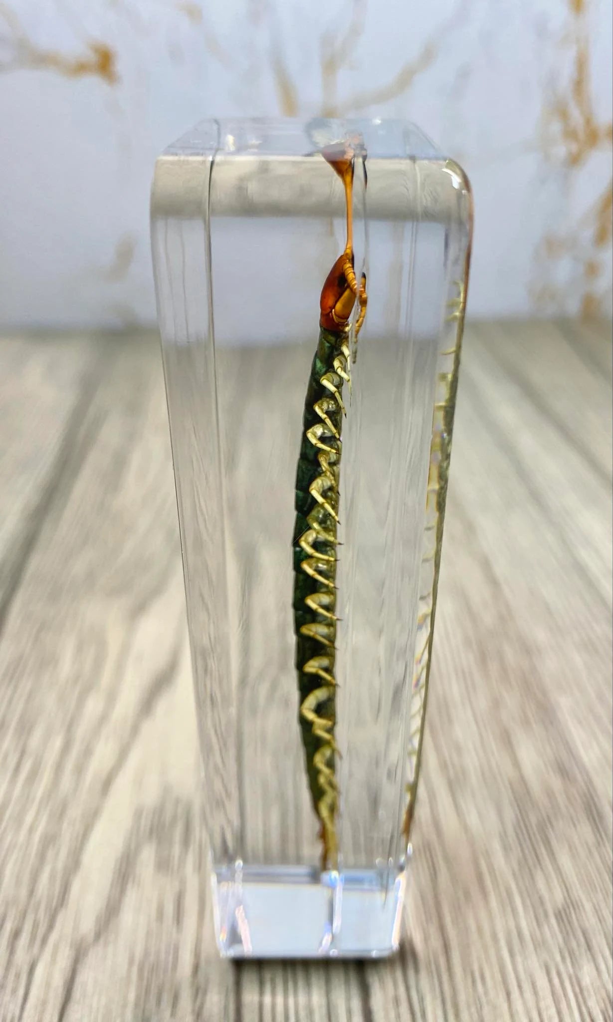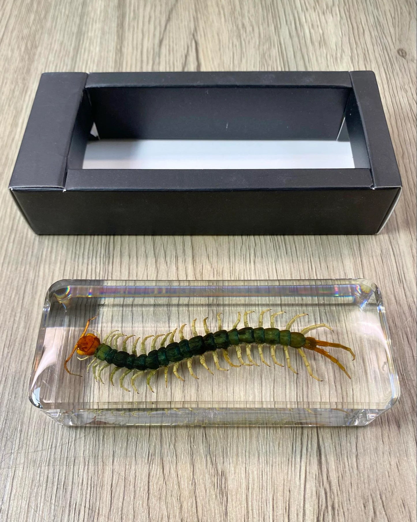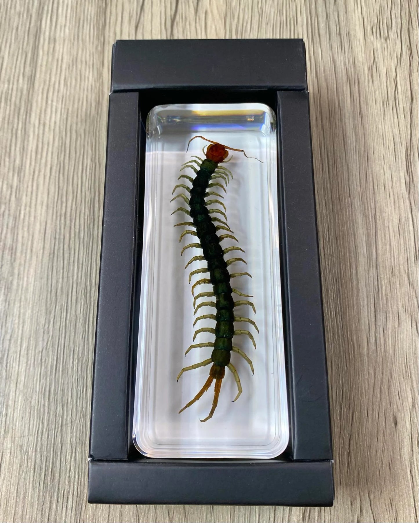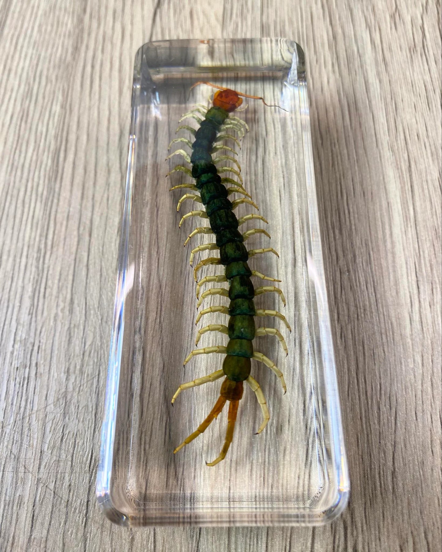This is taxidermy can be a functionable paperweight, it features a large Centipede encased in a clear acrylic block filled with resin. The intricate details of each specimen are preserved beautifully, making it a perfect addition to any collection of taxidermy or animal collectables. Crafted from high-quality resin, this paperweight is sturdy and durable, ensuring that it will last for years to come. This item is ideal for anyone who appreciates the beauty of insects and butterflies and is looking for a unique and eye-catching display piece. Add it to your collection today!