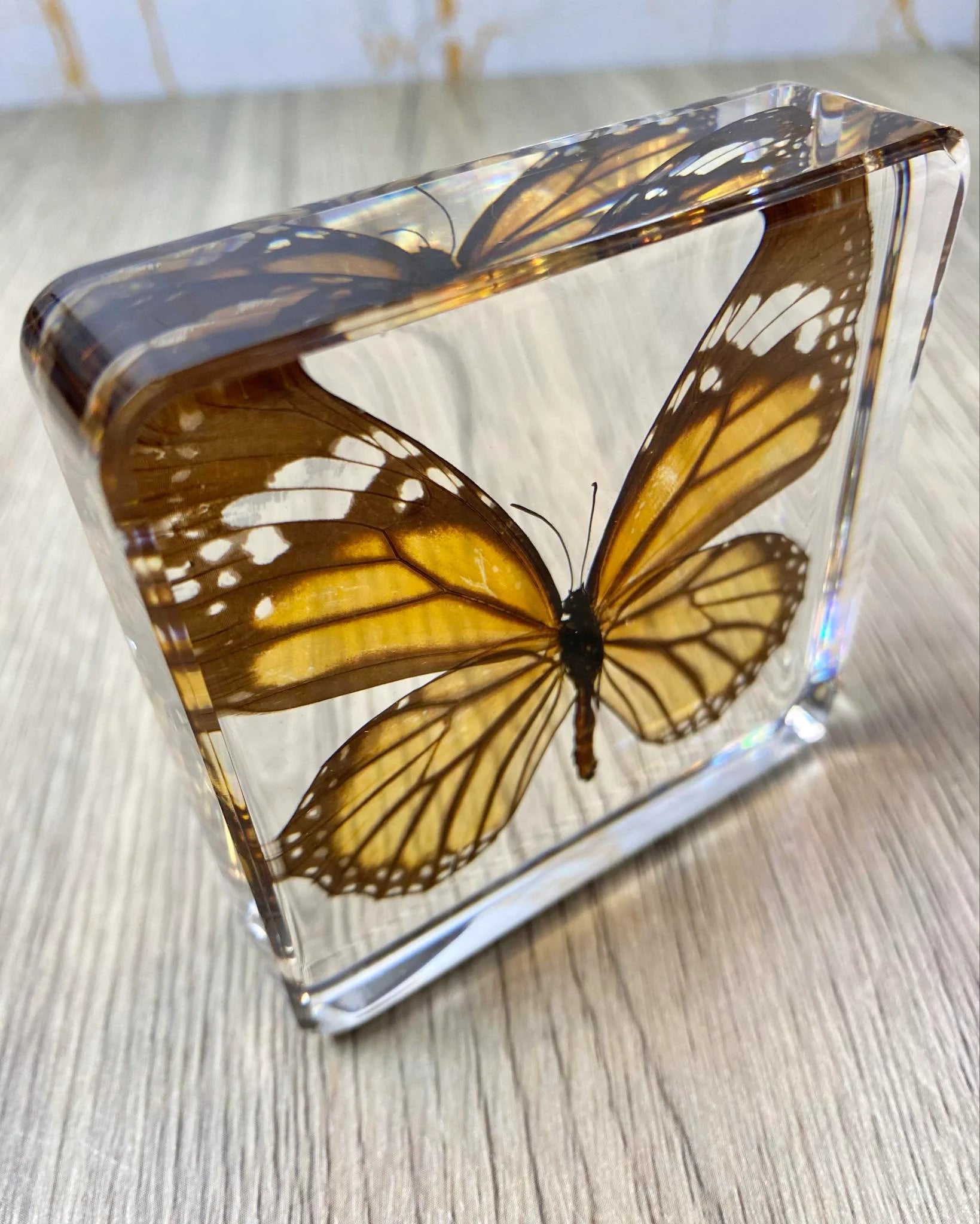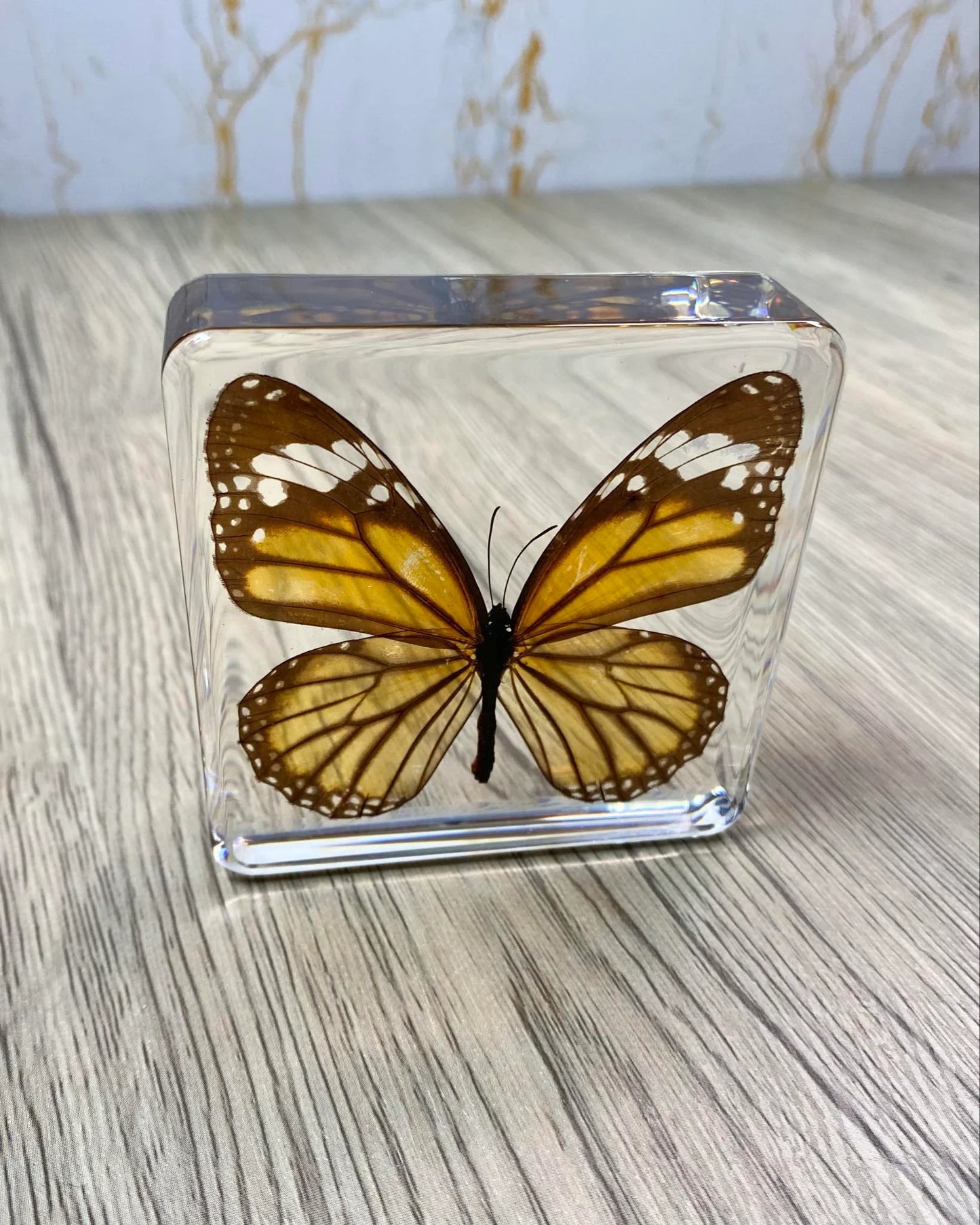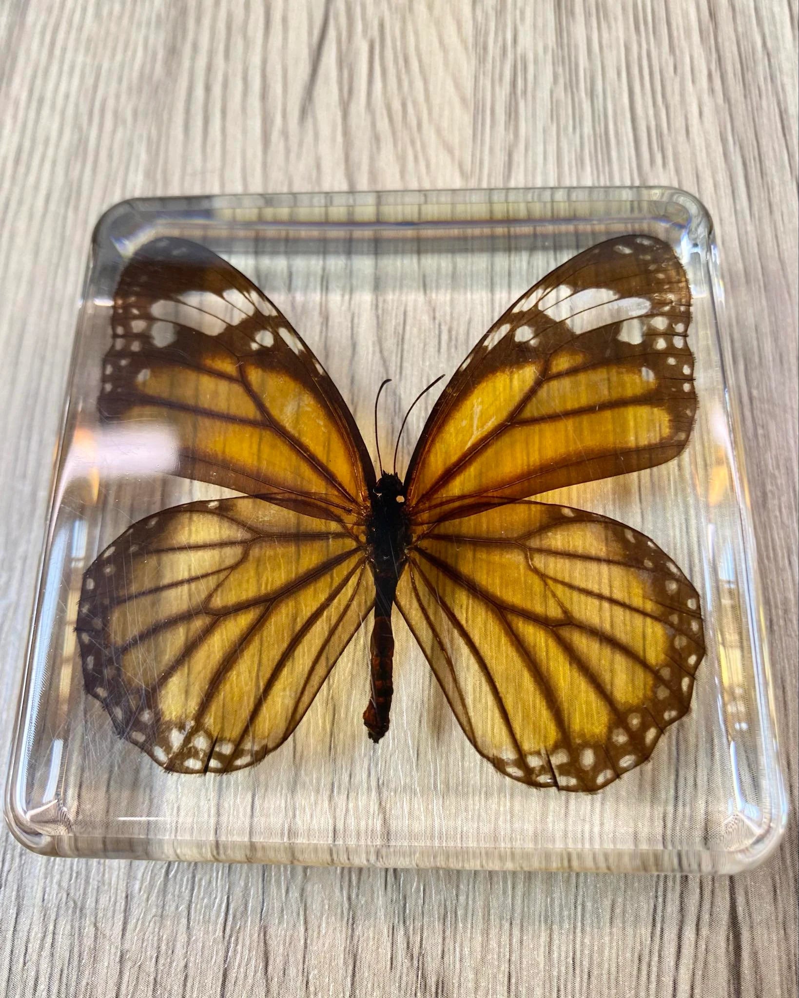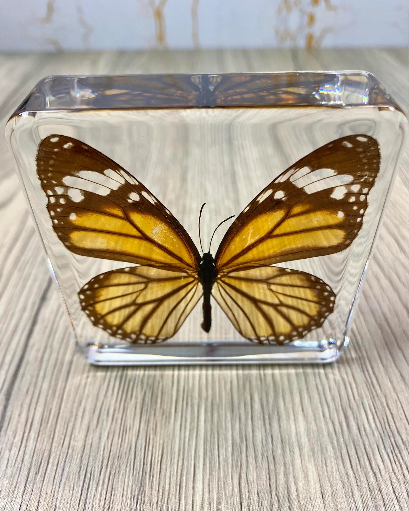 This is taxidermy can be a functionable paperweight, it features a Monarch Butterfly encased in a clear acrylic block filled with resin. The intricate details of each specimen are preserved beautifully, making it a perfect addition to any collection of taxidermy or animal collectables. Crafted from high-quality resin, this paperweight is sturdy and durable, ensuring that it will last for years to come. This item is ideal for anyone who appreciates the beauty of insects and butterflies and is looking for a unique and eye-catching display piece. Add it to your collection today!